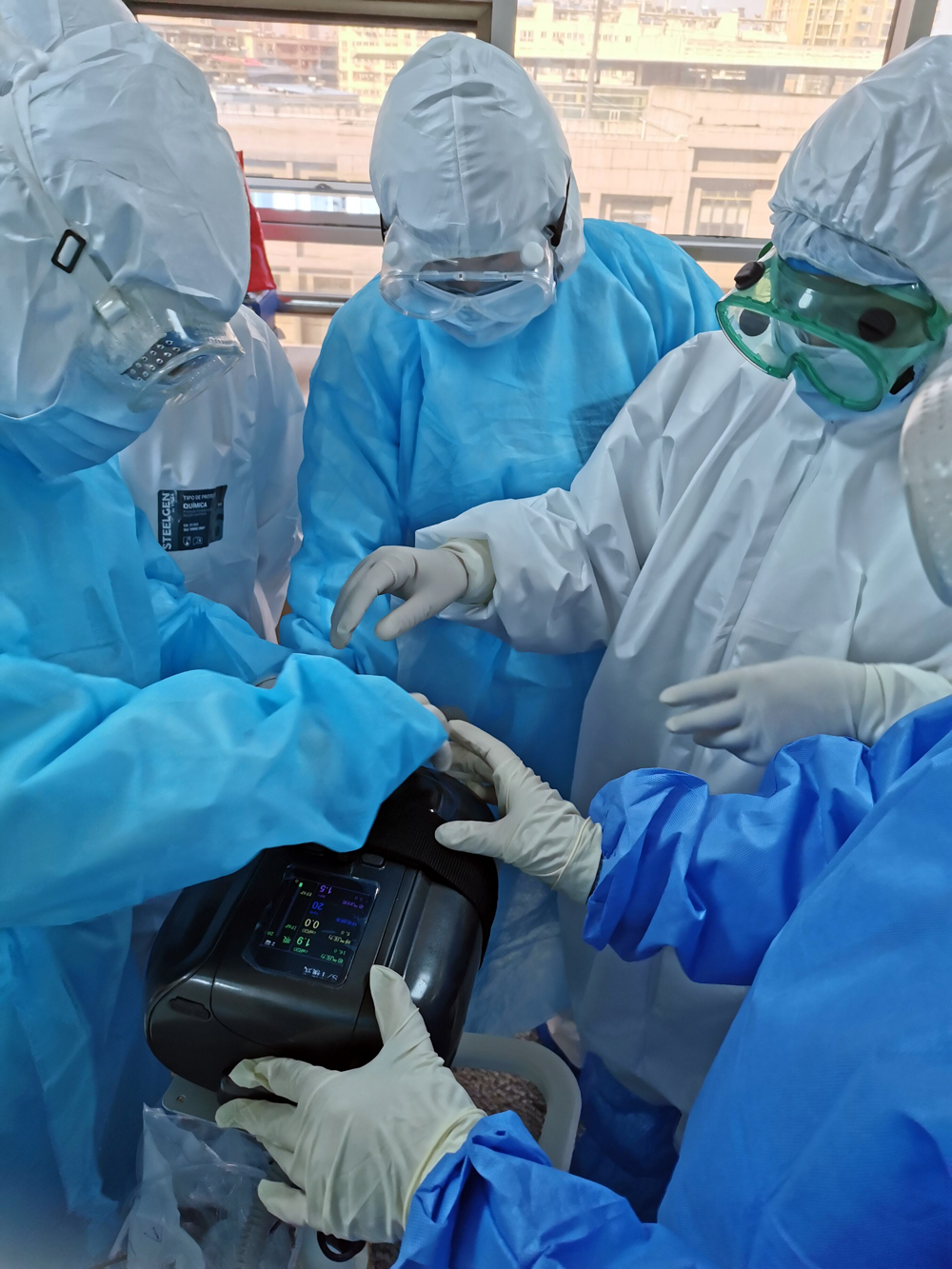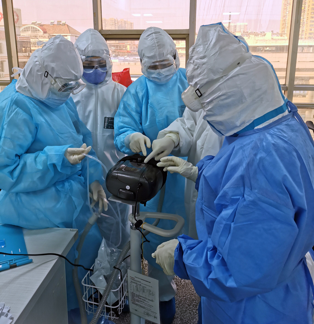 内六病区患者病情由轻到重,到现在基本趋于大部分病情很严重,很多患者需要使用呼吸机。大家积极主动学习呼吸机的操作,落实护理工作安全。护理工作压力越来越大,虽然看到大家下班都喊累,下班每个人脸上都是口罩的压痕,衣服和头发都被汗水浸湿了,双手都被泡白了,但是只要换上防护服,上班的时候大家还是忘我的工作着。护理工作开展其实很难,在这人员紧缺,物资紧缺的情况下,有这么一群人一起努力工作,共同坚守,再难大家都会一起度过。