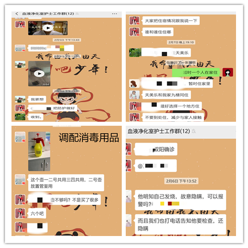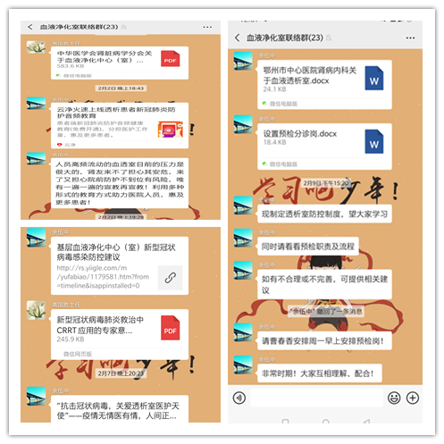 血液净化室属于人群集中、流动性大的交叉区域,透析患者抵抗力低,属于易感人群。为了确保透析患者、家属及工作人员的生命安全及健康,保证透析治疗的顺利进行,科主任高国胜、余伍中在科室微信群及时发送中华医学会及湖北省血液净化室防控建议,且不断更新,要求大家认真学习,掌握相关流程。并且雷厉风行及时采取了行动。