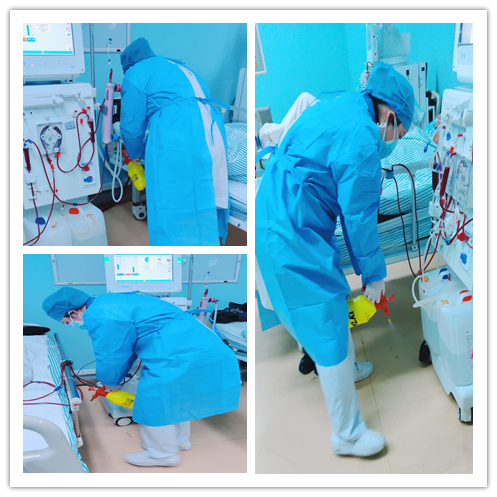 疫情发生后,科室在人员紧张的情况下,每天安排专职护士进行消毒工作。病区每天做到早晨上机完毕消毒,第一班患者透析结束后消毒,第二班患者透析结束后再消毒,每次做到机器表面消毒、机器内部消毒、地面消毒、空气消毒,总之大家有一个共同的信念,不能让疫情在血液净化室发生,这关系到一百多透析患者及家庭的安危。用余伍中主任的话来说就是,消毒消毒再消毒。