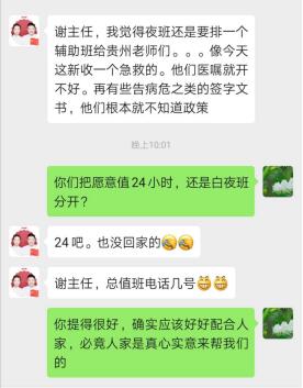 “我院的年轻医生们,也受深受鼓舞,积极主动的参与到本次防控工作中。考虑到穿防护服很难耐受长时间的工作,原本只给他们排长白班,但他们主动申请24小时轮转,尽力协助好贵州来的专家们。