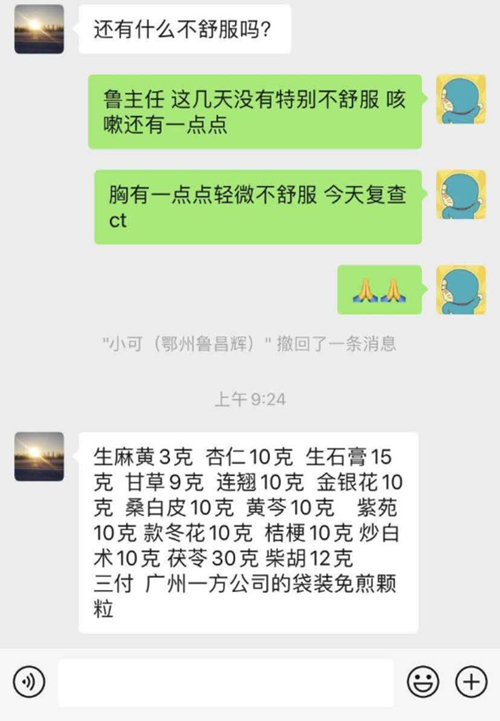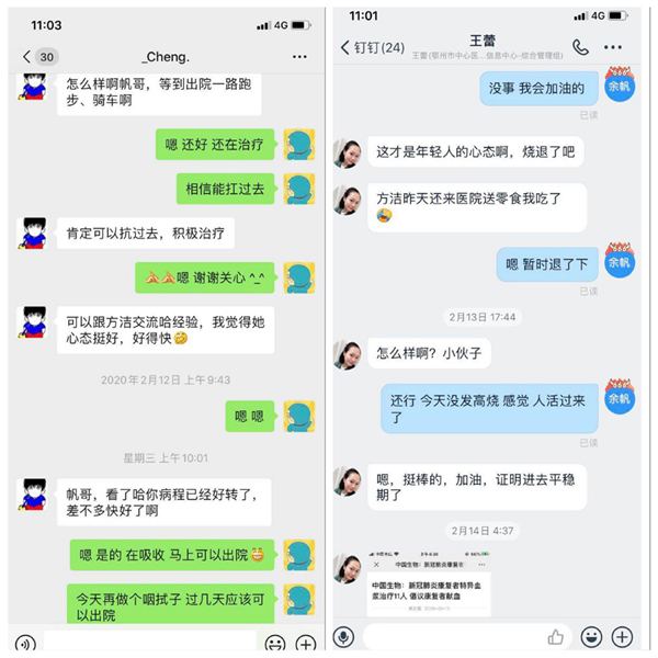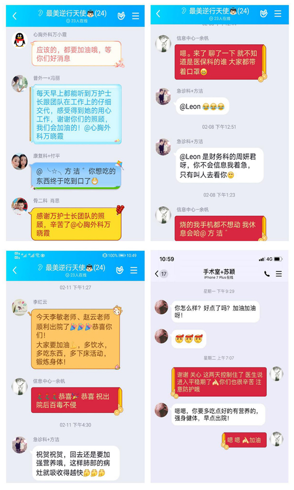 同时还要感谢来自医院和科室的领导,在患病期间对我的慰问和关怀,给了我战胜病毒的信心和勇气。喻院长在百忙中来到病房看望大家给我加油鼓劲,科室主任李鑫、朱阳定期发来问候的信息,同是病友的护士方洁,同事王维、王蕾、程俊峰等人多次来电关心鼓励。更有医术精湛的徐广主任,十分关注我的病情,每天中午都会抽空来给我介绍病毒的发病原理和我疾病的进展情况,他专业的讲解让我对疾病有了更深的了解。中医科鲁昌辉主任,在微信上为我远程会诊,实时调整中药药方、阶段性开具对症中药,为我的治疗提供了很大的帮助。在住院的这段时间,我充分感受到了来自医院这个大家庭的温暖,让我能有动力对抗病毒,在这么短的时间内康复。希望我能尽快回到岗位上,和大家一起并肩战斗,为此次抗疫战贡献微薄之力。
