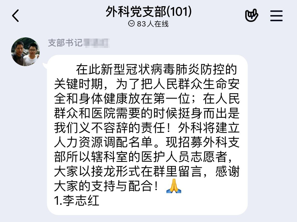 李主任自大年三十起,就一直驻扎在科室,指导大家科学开展防疫工作。作为外科党支部书记的他,第一时间在支部群内发出了倡议,号召外科人积极投身这场战斗中去,收到了全体外科人积极的响应。