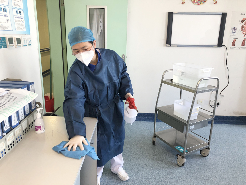 在这次疫情中,还处于哺乳期的董丽兰护士长没能进入一线,但她是全科人员坚强的后盾,尽心尽力做好所有的后勤保障工作,把科室管理得井井有条。在她心里有一个愿望:就是希望科室人员能做到“零感染”!她亲自为护士们培训、示范穿脱隔离衣,交代注意事项。每当有医护要转入一线病区时,她都会在群里反复叮嘱:要规范穿脱防护装备,严守各项操作规程,认真做好自身防护,所有人一定要平安归队!为保护好科室留下来的易感人群(孕期、哺乳期护士),她制定了消毒班的工作流程,并亲力亲为做好科室的全面消毒工作。