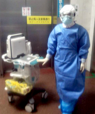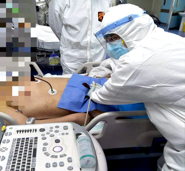 由于新冠肺炎常可并发病毒性心肌炎以及肺部病变可继发心功能不全等原因,使得隔离病区的心脏超声检查尤为重要。超声科副主任吴庆及党员洪云积极报名请战一线隔离病区,为临床治疗方案的制定提供了依据和保障。在隔离病房内,为了明确病人的病情,检查过程中他们与病人长时间的零距离接触,认真仔细的为病人检查。