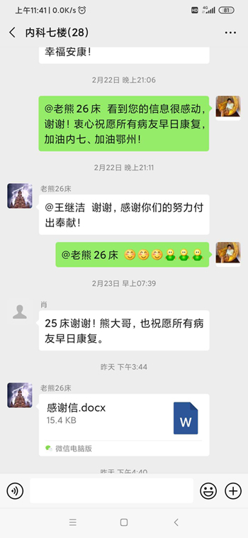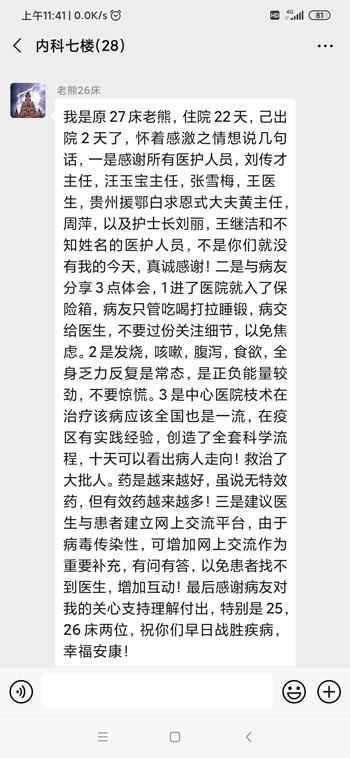我叫熊文斌,家住东方世纪城7栋3单元1001室,是原27床的住院病人,年前不幸感染新型冠状病毒,于1月30日入院治疗,在医院我浑浑噩噩二十二个日日夜夜,是全体医护人员的悉心照顾,精心治疗,特别是刘传才主任、汪玉宝主任、张雪梅医生、王医生,以及贵州援鄂白求恩式大夫黄主任、周萍医生,对每一位患者问寒问暖,每日坚持面对面查房不计其数,还有护士长刘丽、王继洁和其他不知姓名的医护人员,总是有求必应,病人身边虽然无一亲人,你们却胜似亲人。