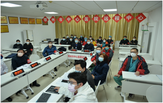 2月26日下午4点30分,通过远程视频大屏幕,北京大学国际医院的专家教授们为市中心医院抗击新冠肺炎病毒“传经送典”。当日下午,在鄂州市中心医院远程会议中心,医院抗“疫”医疗专家组全体成员参加了这场远程的医疗会诊集中讨论。