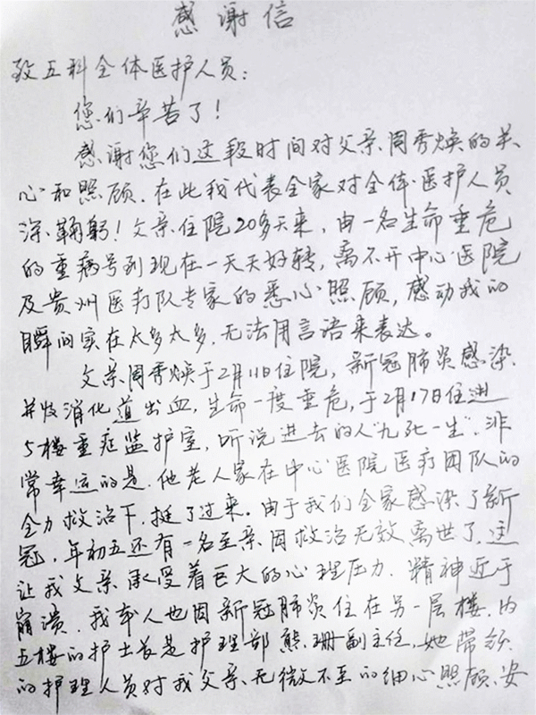 九死一生、脱离危险时,老人一定要亲自写感谢信,感谢熊珊和医护团队成员“不是亲人,胜似亲人”的关怀和照顾。