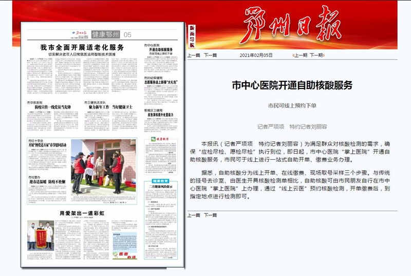 本报讯(记者严项项 特约记者刘丽容)为满足群众对核酸检测的需求,确保“应检尽检、愿检尽检”执行到位,即日起,市中心医院“掌上医院”开通自助核酸服务,市民可于线上进行一站式自助开单、缴费业务办理。