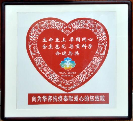 8月25日,华容区区委书记彭波、代理区长龚骏等一行5人代表华容区向我院赠送非物质文化遗产窗花牌匾。彭波书记向鄂州市中心医院支援华容区抗疫的工作人员表示衷心的感谢,感谢鄂州市中心医院在华容区最危险的时候雪中送炭。我院党委书记、院长刘黎明率全体院领导班子成员参加了赠送仪式。