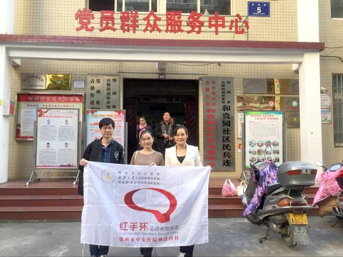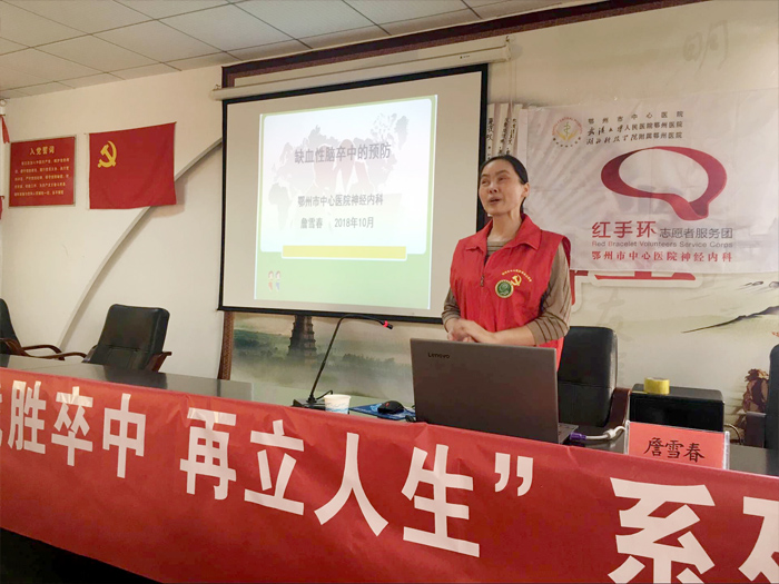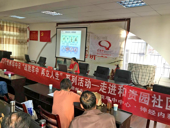 作为“世界脑卒中日”活动的一部分,当天下午鄂州市中心医院卒中中心携神经内科的医护人员以及红手环志愿者们,在古楼街道和贵园社区举办了一期“脑卒中的早期预防”知识讲座。