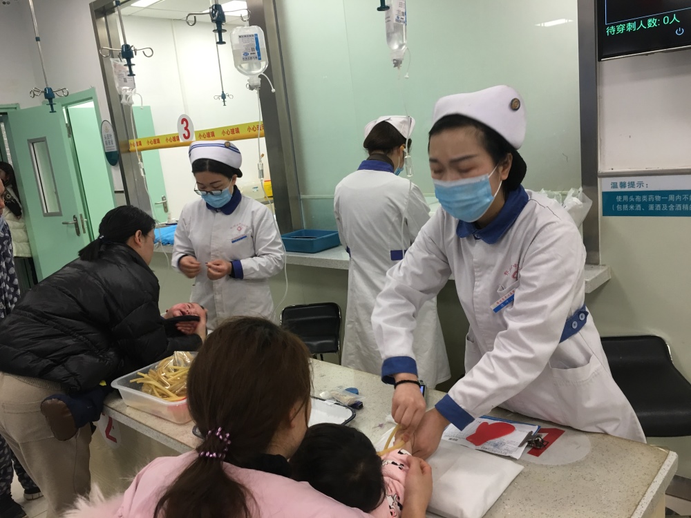 在病人多,工作量大,科室人力资源不足的情况下,为了确保患者的输液安全,科室的姐妹们主动加班加点,团结一致,没有抱怨,顾不上吃饭喝水上厕所,脚不离地的为患者服务,恨不得自己的脚底踩着“风火轮”上班。