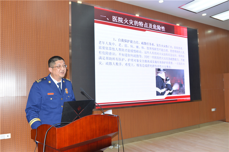 培训会上,鄂州市公安消防支队周星教官以幻灯片的形式对医院火灾的特点及危险性、医院典型火灾案例、医院消防工作存在的突出问题、如何做好医院消防安全管理、常用消防知识普及五个主题进行了详细的分析,并向参会人员播放了近几年城市医院火灾视频。