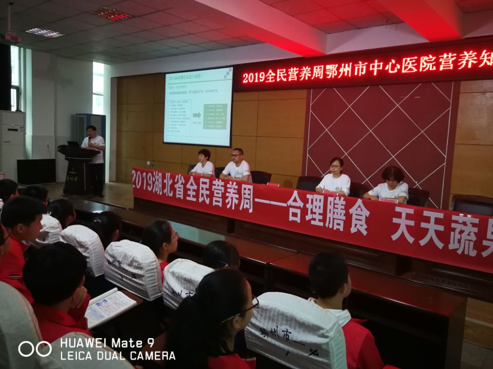 为丰富中学生的健康知识,培养中学生健康的饮食习惯,5月15日下午,鄂州市中心医院门诊党支部、营养科联合鄂州市第一中学,在该校校区举办了一场“全民营养周-营养知识进校园”的宣传活动。鄂州市第一中学政教处李研平主任出席了本次活动并致辞。