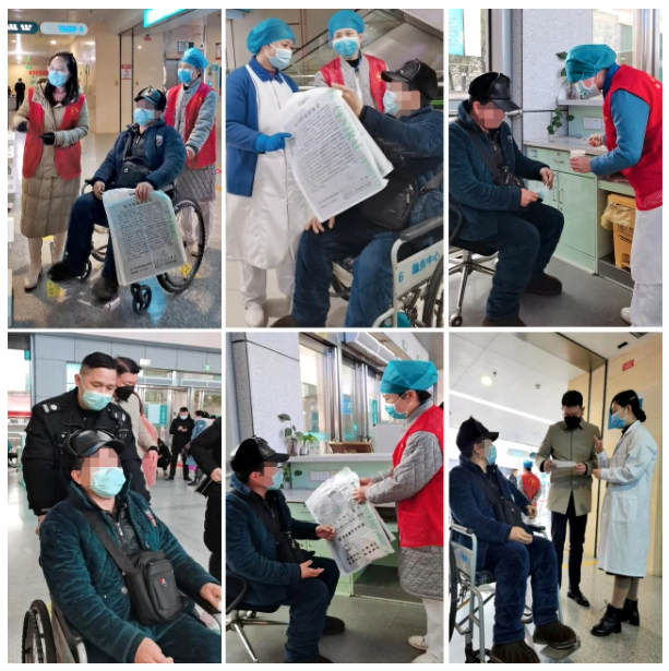 2月1日上午8点30分,外边下着小雨,一位60多岁的爹爹行动不便、步履蹒跚走进门诊大厅,见这位行动不便的老人焦急无助的在门诊大厅徘徊时,志愿者蔡丽立即上前询问老人情况,从他含糊不清的语言和他用手比划的沟通中,得知他中风后二年,语言和右侧肢体功能严重受损,家人对他的病情也不再关心了。说着老人抹起了眼泪,在得知老人没有亲人陪同,志愿者帮助老人换了破旧的口罩,扶老人坐下,帮助老人去放射科拿CT片子,志愿者王旭华又送来温水给老人,让老人家边休息边等候,推来轮椅扶老人坐好,随后帮助老人挂号,并护送老人到二楼就诊区,与导医人员一起送至诊室,志愿者们热情的为患者挂号、缴费、拿药,很快完成了在医院的就诊流程。门诊支部书记朱艳萍见外边下雨,患者行动又不便,担心路上容易跌倒,主动联系患者的家属。保卫科副科长秦操得知老人的情况后,派保安人员协助患者去洗手间,与患者家属联系,送患者上出租车等。患者走时,激动的握着志愿者的手表示感谢,他说志愿者让他体会到了温暖,虽然他的表达不是很清晰,但感谢是真诚的。