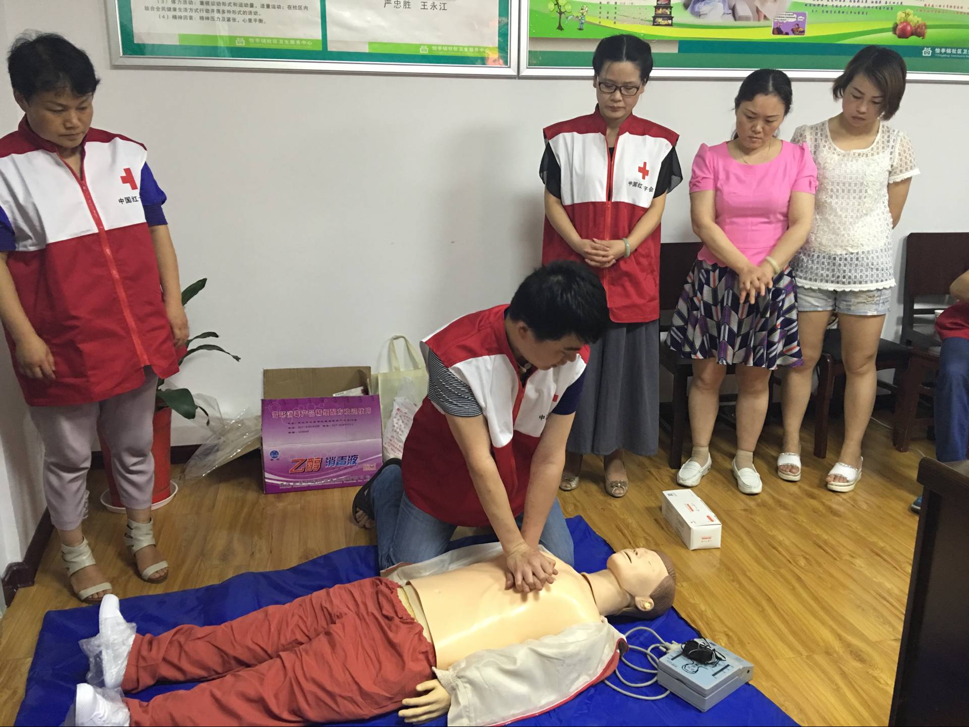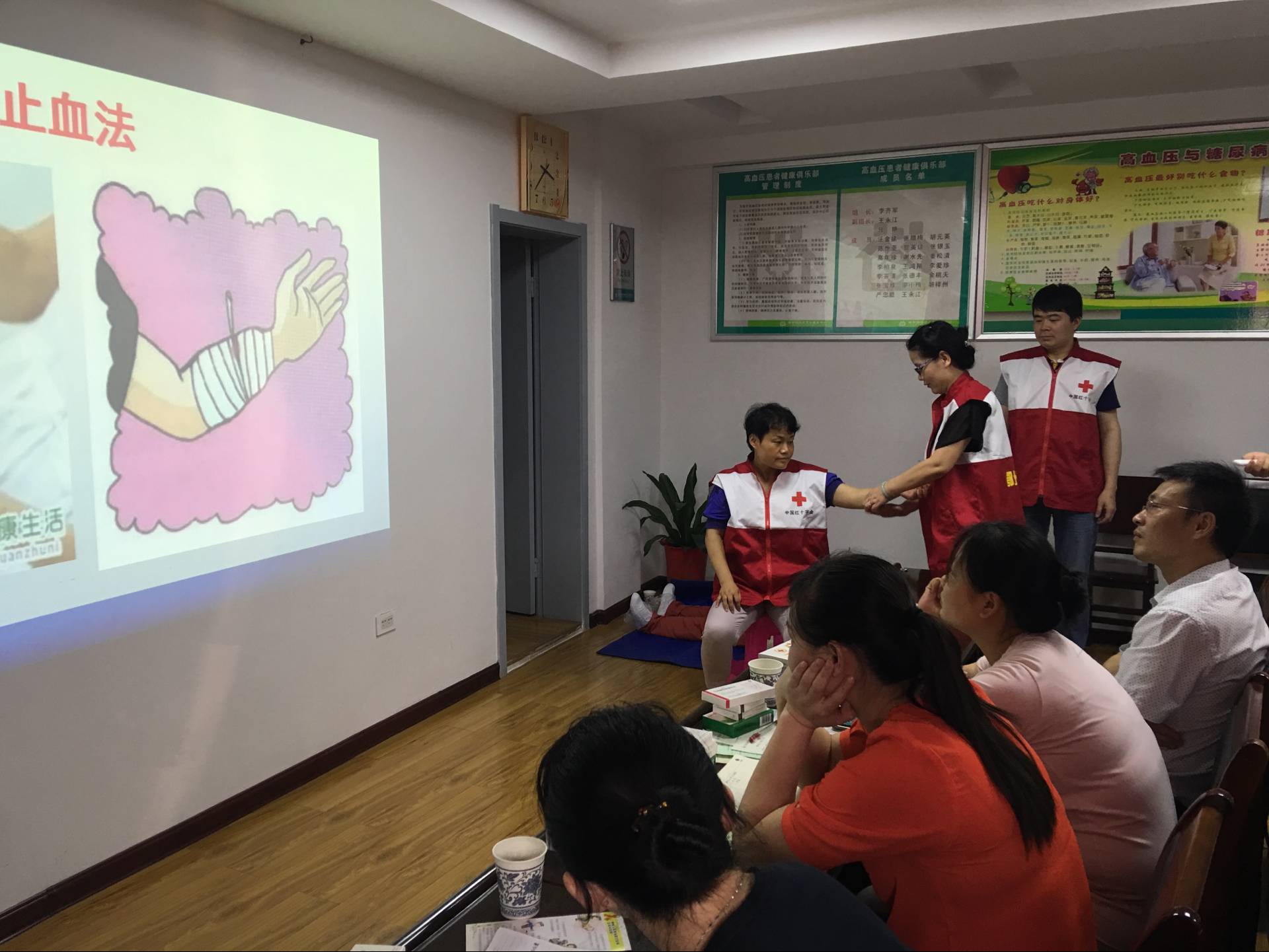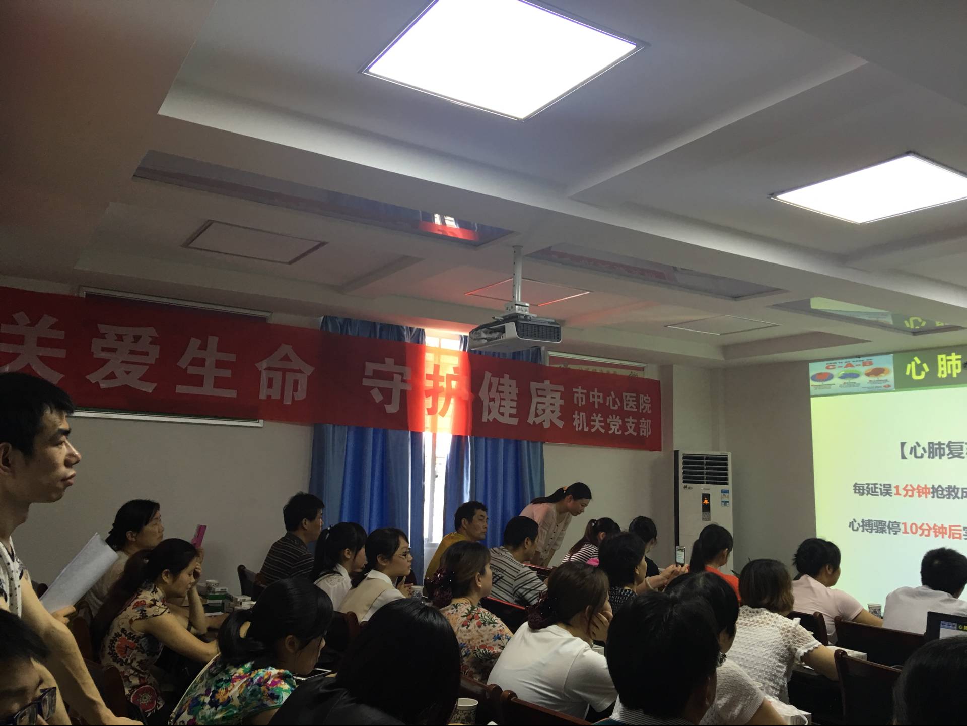 6月22日下午,市中心医院机关党支部组织15名党员来到环境洁净、管理秩序井然的怡亭铭社区卫生服务中心,开展“两学一做”主题日活动“关爱生命 ,守护健康”,向居民宣讲和传授应急自我救护技能,深受居民和社区卫生服务站医护人员的热烈欢迎。这次活动主要是针对日常工作生活中,居民面对突发事件因束手无策错过急救良机,或在紧急状态下因惊慌失措、处理不当酿成悲剧而举办的一次讲座。