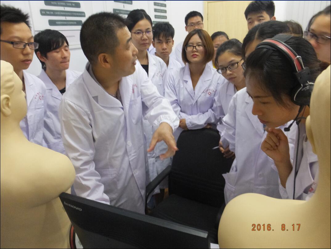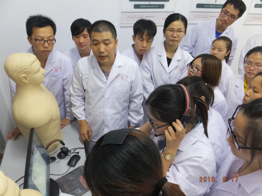 8月17日下午3时,2016级规培学员迎来了首次技能模拟培训——心肺听诊和体格检查。此次培训由大内科总带教老师高国胜主任授课。高主任首先通过PPT课件进行了“胸部体格检查”理论讲述,然后带领规培学员们更衣后进入412内科基地模拟示教室进行培训。高主任按照“胸部体格检查”的标准,在心肺听诊模拟训练系统及模型人上进行了示教,然后择优抽出4名学员分别对其进行“一对一”的操作指导和考核,合格后分成四组,每组1名,其他学员纷纷开始练习,并接受考核,保证人人过关。