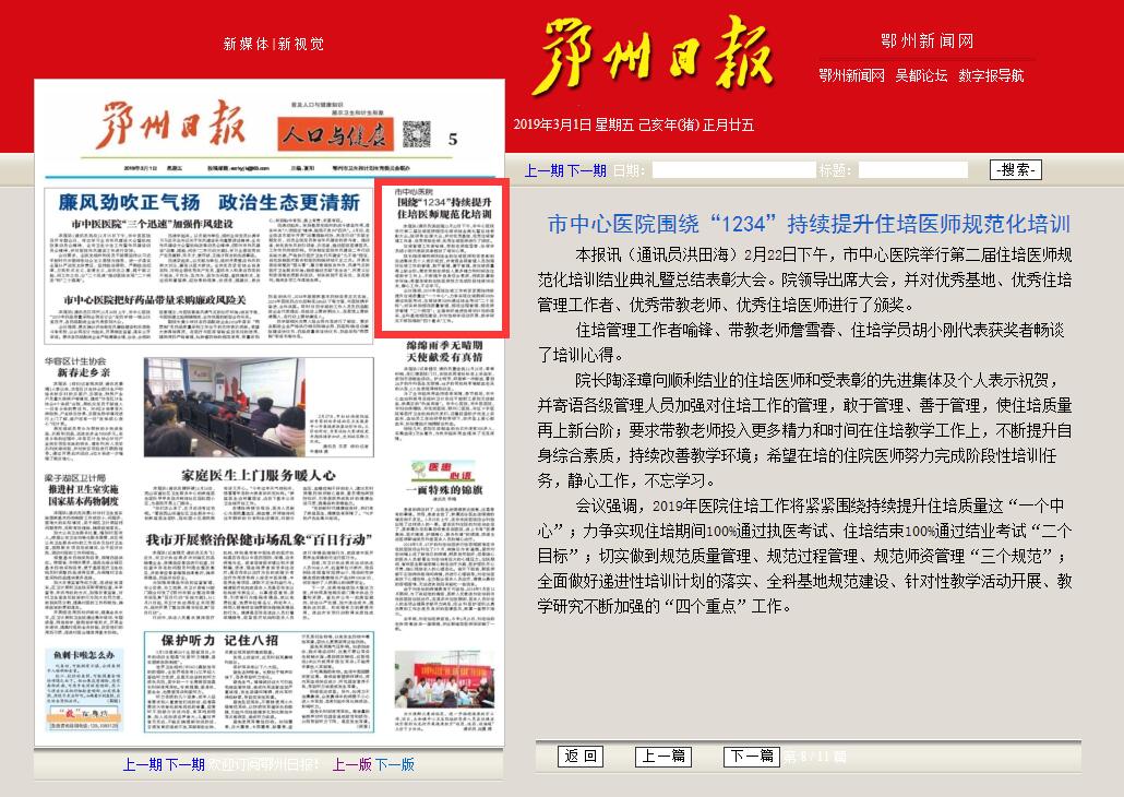 鄂州日报讯(通讯员洪田海)2月22日下午,市中心医院举行第二届住培医师规范化培训结业典礼暨总结表彰大会。院领导出席大会,并对优秀基地、优秀住培管理工作者、优秀带教老师、优秀住培医师进行了颁奖。